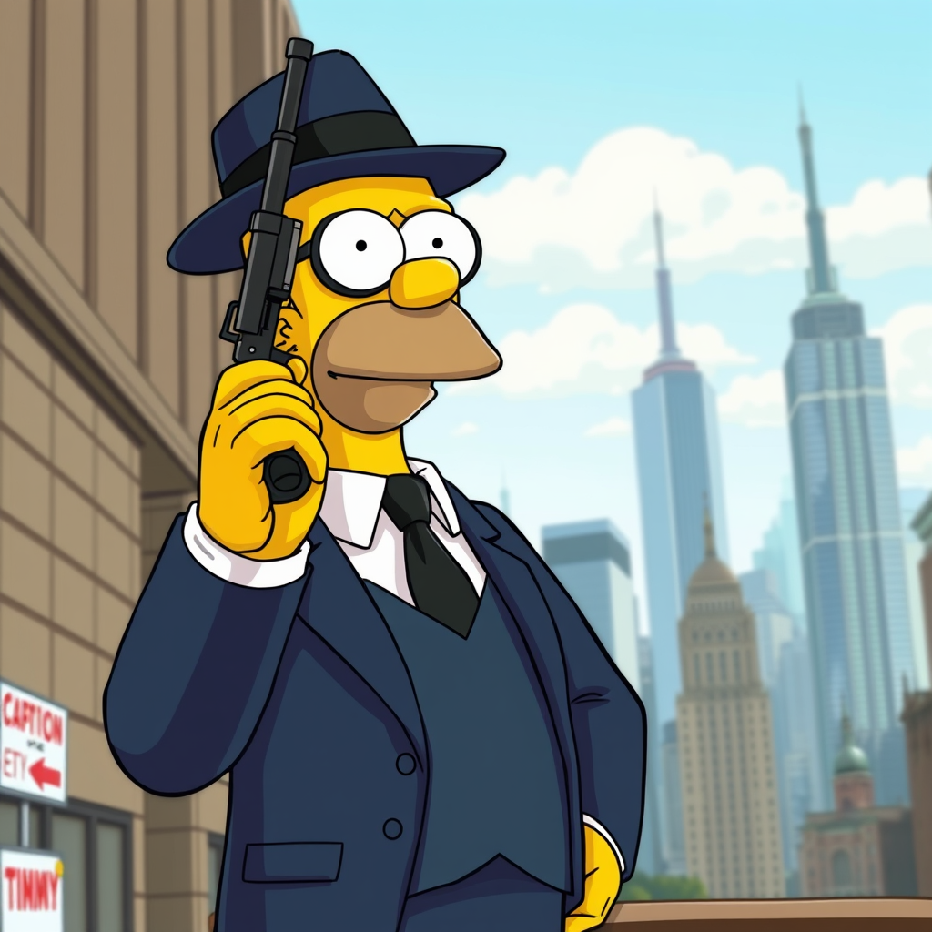 Homer Simpson, clad in a sharp Gucci suit, exudes 1930s Mafia gangster coolness in NYC, holding a sleek tommy gun, the city's skyline visible in the background, embodying the essence of vintage style with a modern twist.