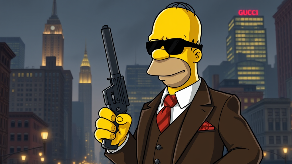 Homer Simpson, clad in an impeccably tailored Gucci suit, exudes timeless gangster charm reminiscent of 1930s Mafia style. Holding a sleek tommy gun, his cool and confident demeanor matches the bustling aura of the iconic NYC skyline in the background. The city's towering skyscrapers and vintage streetlights cast a moody glow on Homer as he transforms into the ultimate cartoon mob boss, seamlessly blending classic style with a touch of humorous flair.