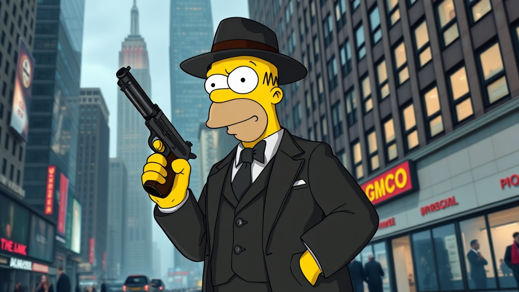Homer Simpson, clad in an impeccably tailored Gucci suit reminiscent of 1930s Mafia style, exudes charisma as he stands with a sleek tommy gun in hand. His confident, cool demeanor is highlighted against the bustling backdrop of New York City, evoking the aura of a classic gangster with a modern twist.