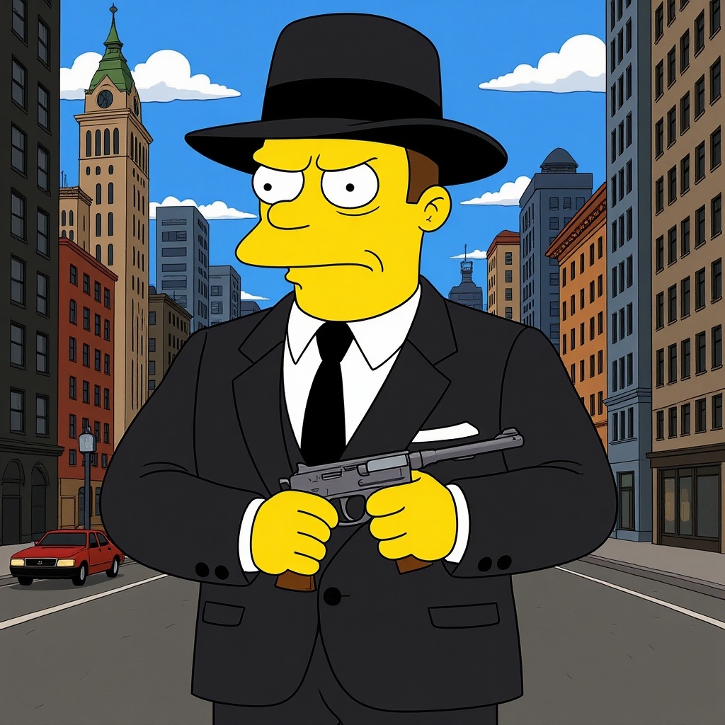 Homer Simpson, decked out in a sharp Gucci suit, embodies the classic 1930s gangster style, exuding a cool, mafia boss vibe. He's holding a tommy gun with confidence, set against the iconic backdrop of New York City, blending seamlessly into the bustling cityscape. The scene is rich with period details, capturing the essence of the golden age of mobsters, while adding a playful twist with Homer at its center.