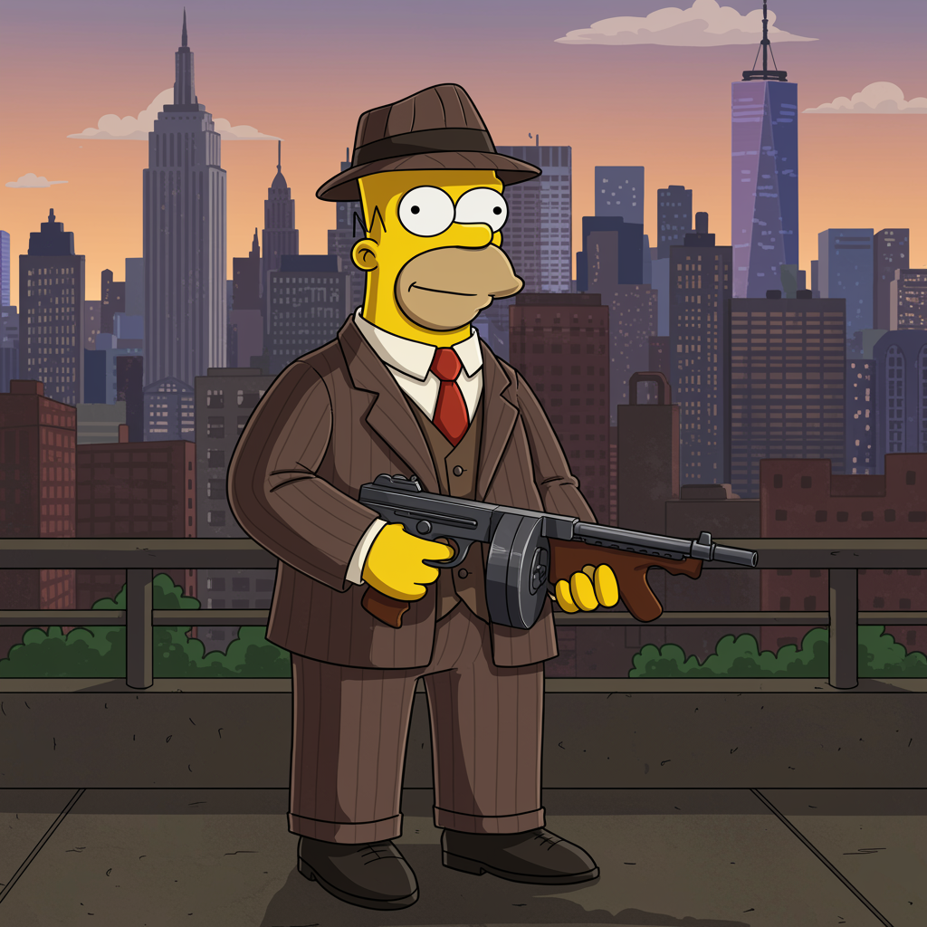 Homer Simpson, decked out in a sharp Gucci suit with 1930s mafia flair, exudes an air of gangster swagger. Armed with a sleek tommy gun, he emanates cool confidence against the backdrop of New York City's iconic skyline, blending timeless style with cartoon charm.