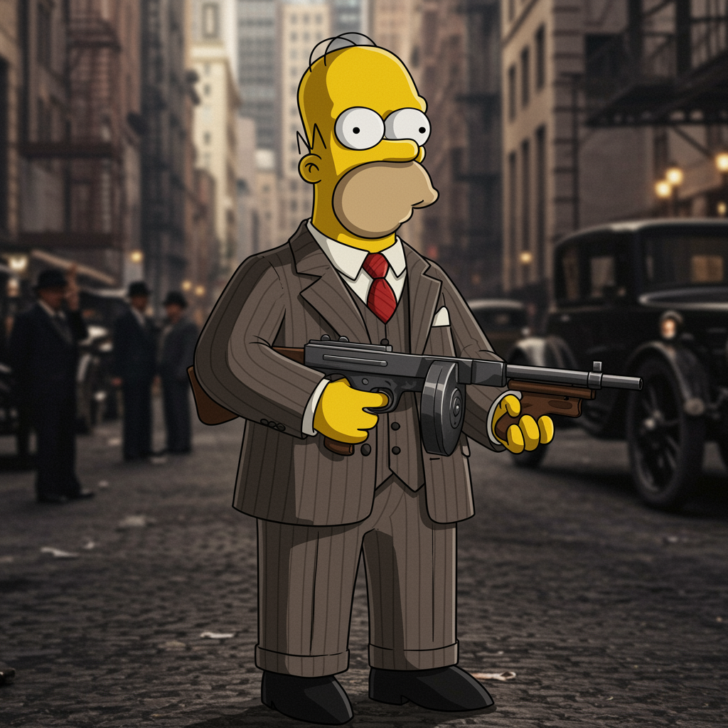 Homer Simpson exuding a 1930s gangster vibe, donned in a sleek Gucci suit, brandishing a tommy gun with effortless cool, set against the bustling backdrop of vintage New York City, embodying an iconic Mafia aura.