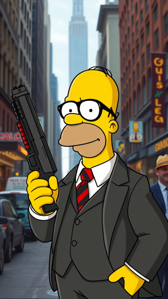 Homer Simpson in a sharp Gucci suit, exuding the aura of a 1930s Mafia gangster, holds a tommy gun with a confident stance amidst the bustling streets of New York City, blending classic gangster cool with a touch of animated charm.