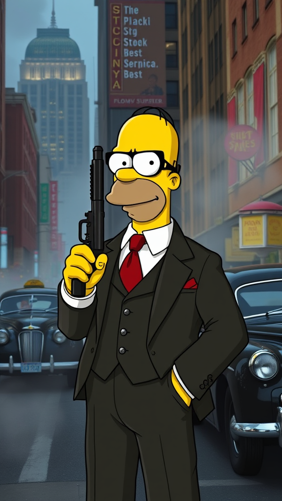 Homer Simpson in an elegant Gucci suit, exuding 1930s Mafia gangster vibes, confidently holding a tommy gun, radiating coolness in a bustling NYC backdrop, smokey streets, vintage cars, and art deco buildings adding to the nostalgic atmosphere.