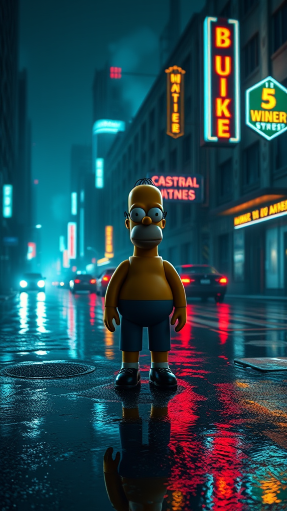 Homer Simpson, rendered in 3D cartoon style, stands in a shadowy, rain-soaked dystopian cityscape. He's alone on a deserted street, surrounded by flickering neon signs casting vibrant reflections on the wet pavement. The scene is cinematic and atmospheric, echoing Blade Runner's moody tones. Elements of steam rise from manholes, and the distant hum of a futuristic metropolis fills the air. The intricate details and hyper-realistic textures make the scene come alive in ultra 4k, with a unique blend of whimsy and melancholy.