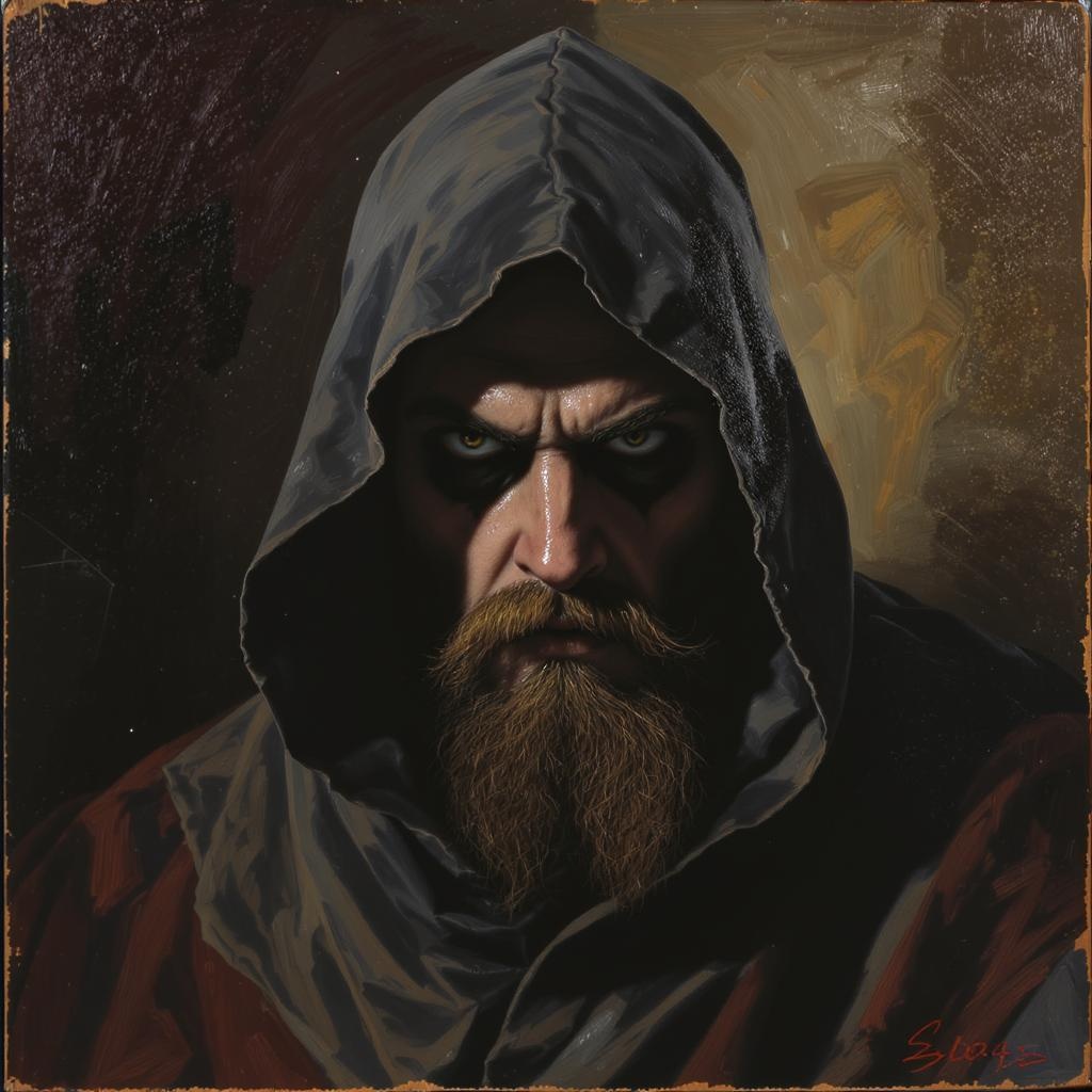 Hooded bearded man portrait, oil painting style with intricate detail and complexity, following the rule of thirds, evoking a sense of madness and intrigue in character concept. Dramatic lighting highlights the figure, employing complementary colors for visual impact -- a play of light and shadow suggesting an atmosphere of mystery and intensity, captured in a balanced square composition.
