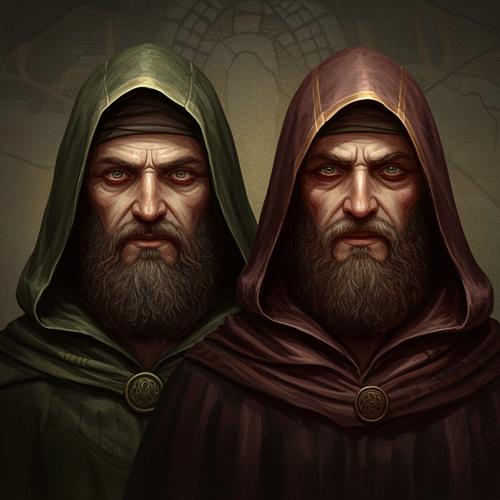 View this AI-generated image featuring hooded bearded men oil painting style detailed portrait intricate complexity following the rule of thirds hint of madness in the eyes unique character concept dramatic interplay of light and shadow vibrant complementary colors balanced composition intense atmos