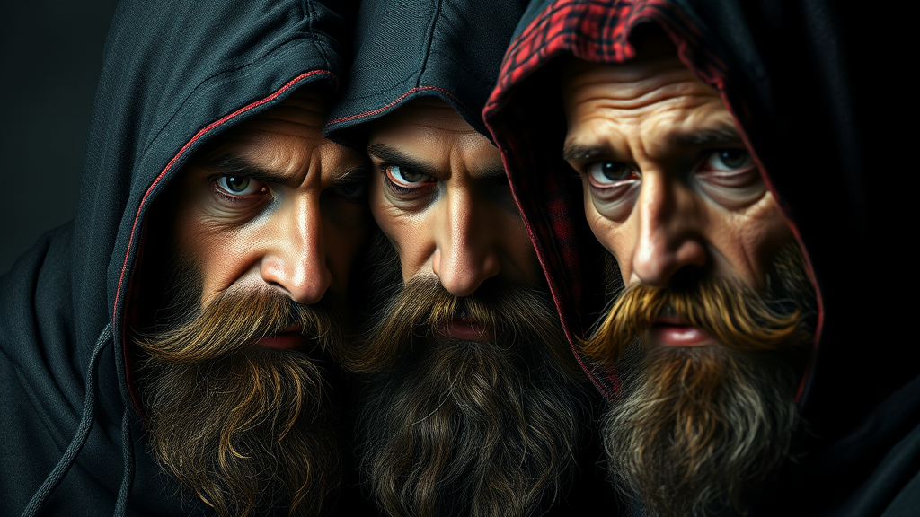 Hooded bearded men in an oil painting portrait, showcasing intricate complexity and a sense of madness, composed with the rule of thirds. The character concept is enhanced by dramatic lighting, featuring sharp contrasts and complementary colors, captured in a balanced 1:1 aspect ratio, with an emphasis on uplight to emphasize depth and emotion.