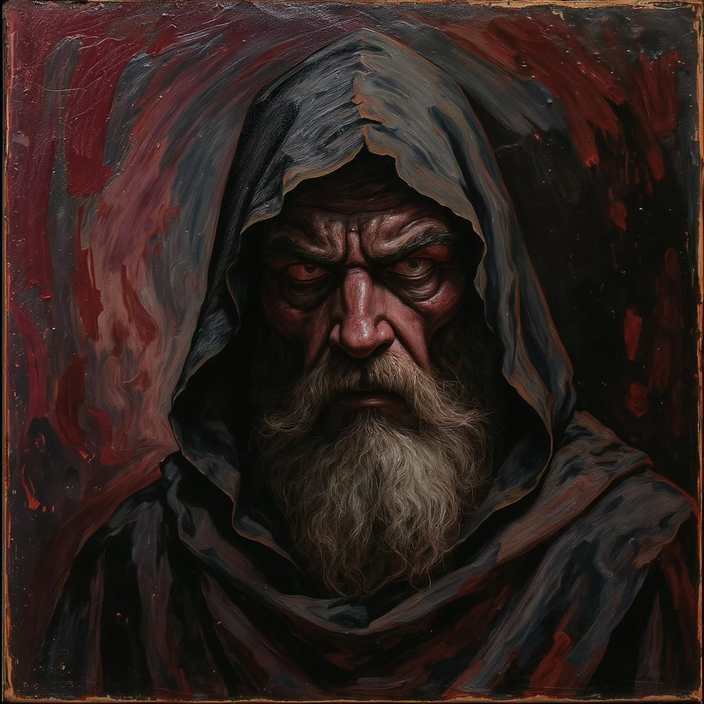 Hooded bearded men, oil painting, portrait with intricate complexity, adhering to the rule of thirds, invoking a sense of madness, character concept with dramatic lighting, featuring a harmonious blend of complementary colors, square aspect ratio, illuminated from below.
