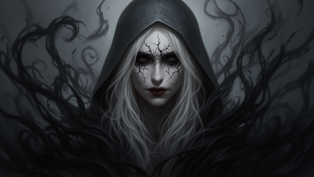 A haunting portrait of a pale, hooded figure with long white hair and a cracked, sinister face. Dark, swirling tendrils surround the figure, creating a mysterious and eerie atmosphere. This digital painting uses dramatic chiaroscuro lighting to enhance its dark fantasy aesthetic.