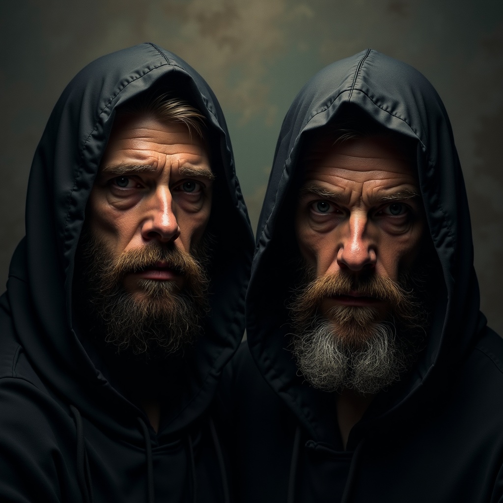 Hooded men with beards, captured in an oil painting style portrait, exhibiting intricate complexity and adhering to the rule of thirds, conveying a sense of madness and character depth, enhanced by dramatic lighting and complementary colors, in a square aspect ratio with a subtle upward lighting effect.
