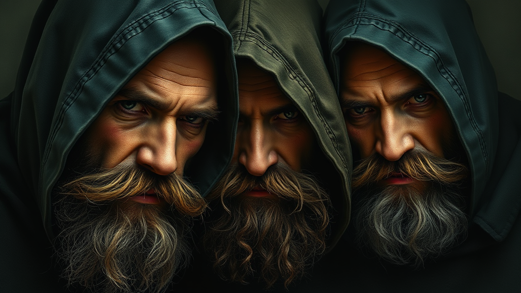 Hooded men with unruly beards, a portrait rendered in the style of an oil painting, showcasing intricate details and complexity. The composition follows the rule of thirds, exploring themes of madness and character depth, illuminated by dramatic and moody lighting. The scene is rich with complementary color contrasts, in a square format, with an ethereal uplift to the visual narrative.