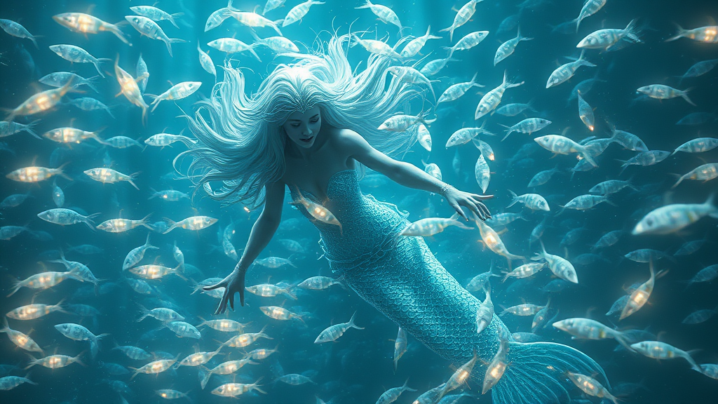 Hopeful creation of a cursed mermaid enveloped by a swarm of luminescent, miniature combat fish, Enchanted Selene, utilizing luxcore, deep cerulean and crystalline white, water's brightness, solarpunk aesthetic, multi-dimensional 5D, cosmic realm, ultra high-resolution crafted in daz3d, 32k UHD detail level.