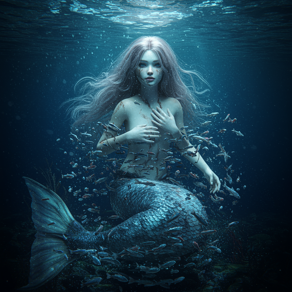 Hopeful masterpiece depicting a cursed mermaid known as Shelma, enveloped by an array of tiny iridescent battle fish, her presence resonating with the luminescence of dark azure and crystalline white, infused by the water’s radiant glow. Embodying a solarpunk spirit, the scene unfolds in a mesmerizing 5D galaxy dimension, rendered in hyper high-definition resolution. Crafted with exquisite detail reminiscent of daz3d artistry, this stunning vision captures the ethereal beauty and haunting elegance in an astounding 32k UHD resolution.