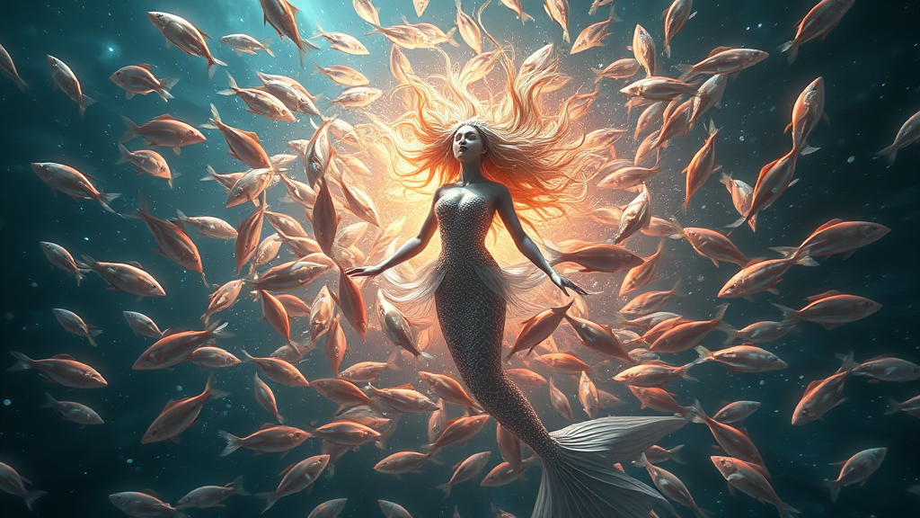 Hopeful vision of a cursed mermaid enveloped by a swarm of radiant, vibrant fighting fish, Enchanted Selira, reflecting a dark azure and white crystalline ambiance, imbued with the luminous essence of water, solarpunk aesthetics, in an otherworldly galactic dimension, hyper-realistic and rendered in ultra-high resolution, crafted using advanced 3D techniques, 32k UHD masterpiece.