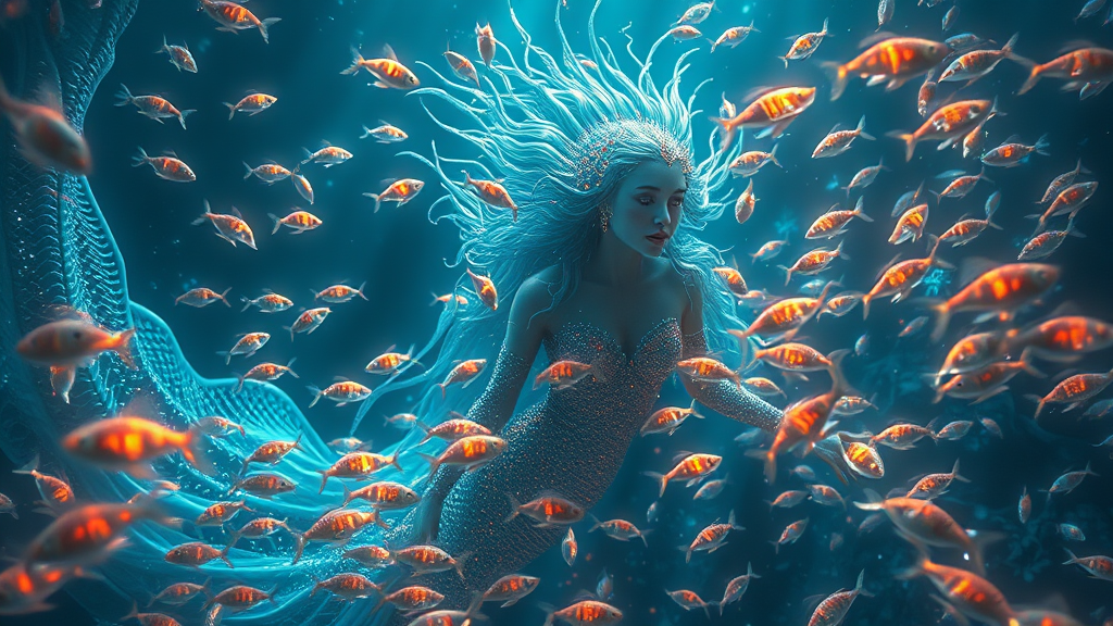 Hope's masterpiece depicting a cursed mermaid named Shelma enveloped by a swarm of luminous, miniature fighting fish, set against a backdrop of dark azure and crystalline white. The scene captures the ethereal glow and vibrancy of the ocean, blending elements of solarpunk with a 5D, galactic dimension feel. This hyper high-resolution artwork, crafted using Daz3D, immerses viewers in its breathtaking 32k UHD detail, with shimmering luminosity and dynamic aquatic life.