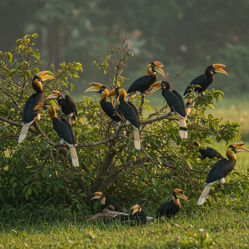 Hornbills gathered at dawn, perched gracefully near the lush fruit trees, meticulously grooming and tending to one another in a serene, almost ceremonial display of companionship.
