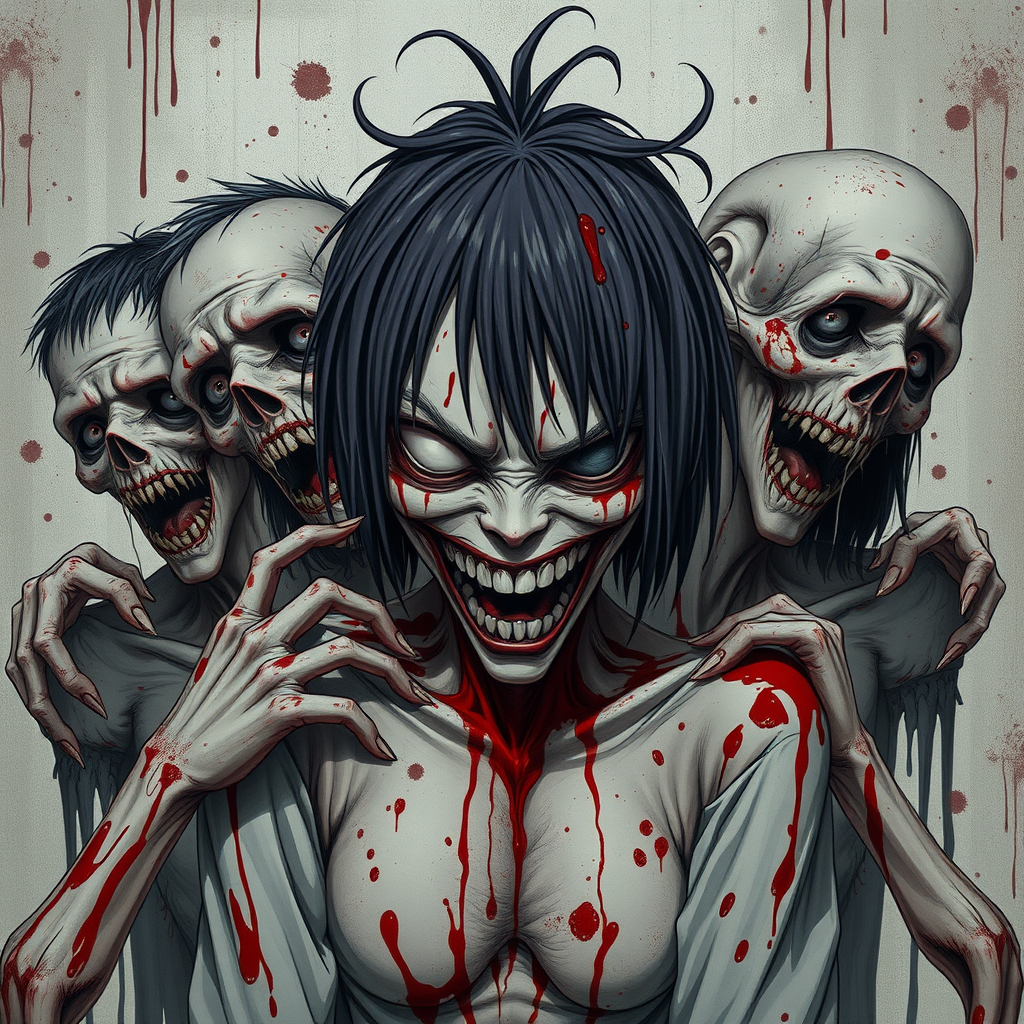 Horror, blood splatter, yandere, sinister grin, ultra high-resolution, 8k, raw photo, hyperrealism, detailed photography, eerie illustration, grotesque, malformed, twisted, unsettling beauty, additional limbs, dual faces, warped figures, nightmarish group, chilling atmosphere, surreal terror, cursed gathering, haunting presence, macabre elegance.