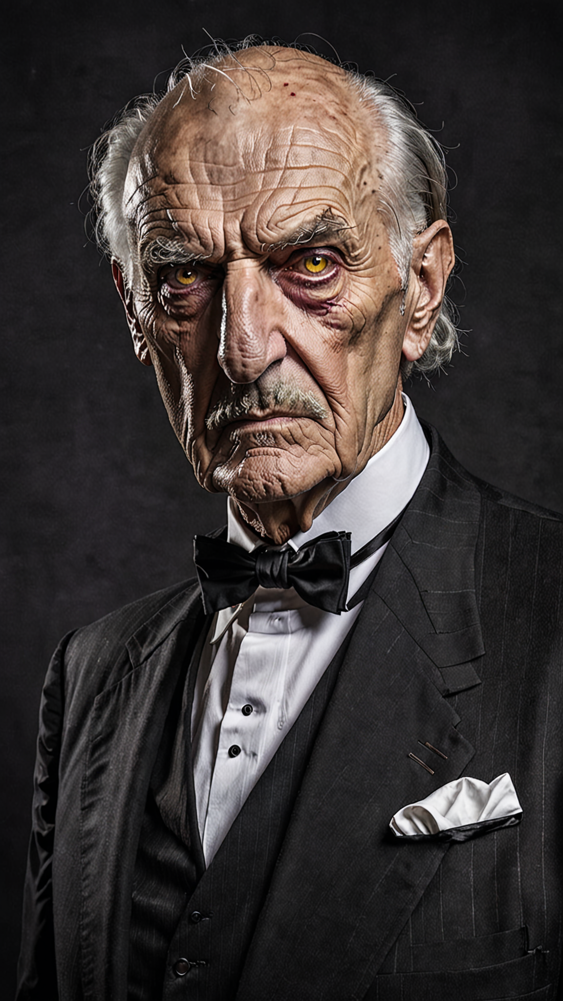 horror. Creepy old Butler, necromancer. Usually surrounded by wispy floating spirits and ghosts. Caucasian male, old man. Grey eyes sunken in, male pattern baldness gray hair (what's left of it). Dour, angry frowning face, never smiles. Wrinkles. No facial hair. Tall, lithe but strong, sturdy. Eggplant colored butlers suit with white shirt and gloves, black bowtie. Black shoes. Full body pose, usually pouring poison tea.