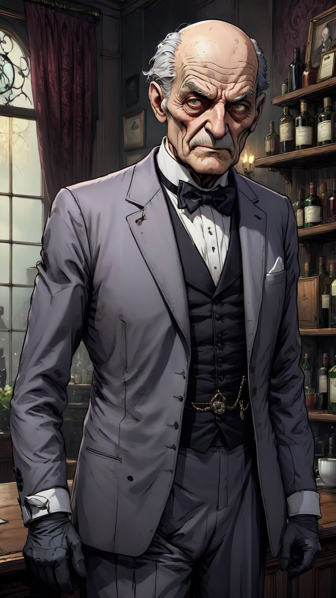 horror. Creepy old Butler, necromancer. Usually surrounded by wispy floating spirits and ghosts. Caucasian male, old man. Grey eyes sunken in, male pattern baldness gray hair (what's left of it). Dour, angry frowning face, never smiles. Wrinkles. No facial hair. Tall, lithe but strong, sturdy. Eggplant colored butlers suit with white shirt and gloves, black bowtie. Black shoes. Full body pose, usually pouring poison tea.