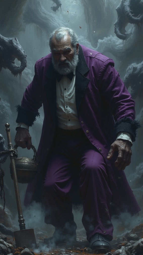 Horror. Creepy old butler, necromancer. Usually surrounded by wispy floating spirits and ghosts. Caucasian male, old man. Grey eyes sunken in, male pattern baldness gray hair (what's left of it). Dour, angry frowning face, never smiles. Wrinkles. No facial hair. Tall, lithe but strong, sturdy. Eggplant colored butlers suit with white shirt and gloves, black bowtie. Black shoes. Full body pose, usually pouring poison tea, or digging a grave.