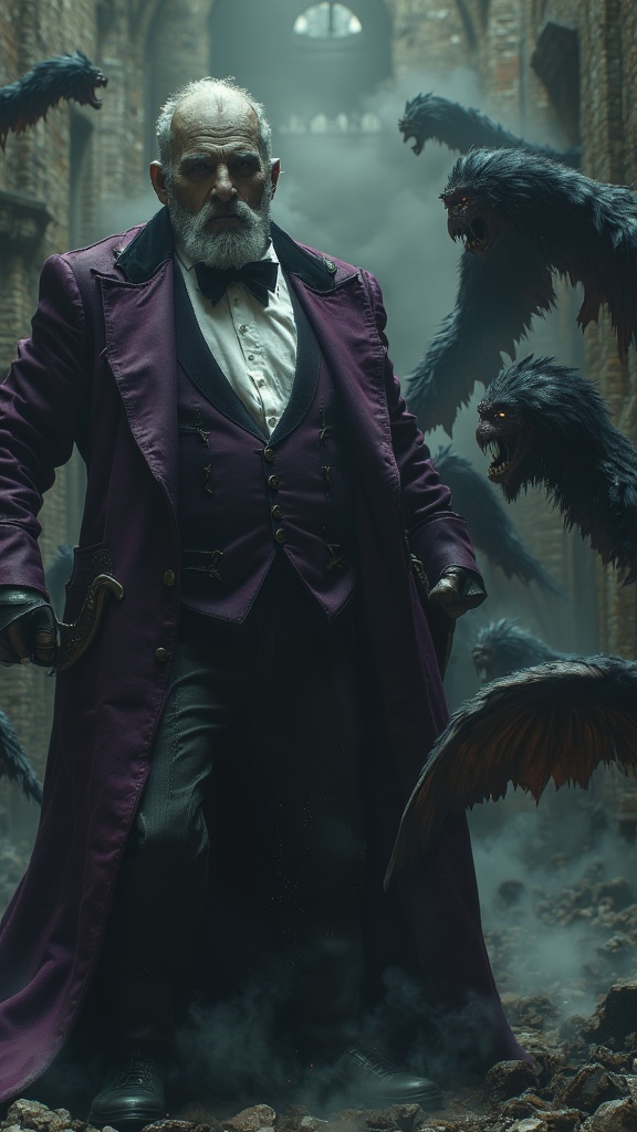 Horror. Creepy old butler, necromancer. Usually surrounded by wispy floating spirits and ghosts. Caucasian male, old man. Grey eyes sunken in, male pattern baldness gray hair (what's left of it). Dour, angry frowning face, never smiles. Wrinkles. No facial hair. Tall, lithe but strong, sturdy. Eggplant colored butlers suit with white shirt and gloves, black bowtie. Black shoes. Full body pose, usually pouring poison tea, or digging a grave.