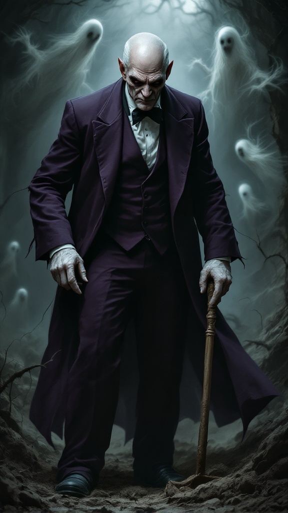 Horror. Creepy old butler, necromancer. Usually surrounded by wispy floating spirits and ghosts. Caucasian male, old man. Grey eyes sunken in, male pattern baldness gray hair (what's left of it). Dour, angry frowning face, never smiles. Wrinkles. No facial hair. Tall, lithe but strong, sturdy. Eggplant colored butlers suit with white shirt and gloves, black bowtie. Black shoes. Full body pose, usually pouring poison tea, or digging a grave.