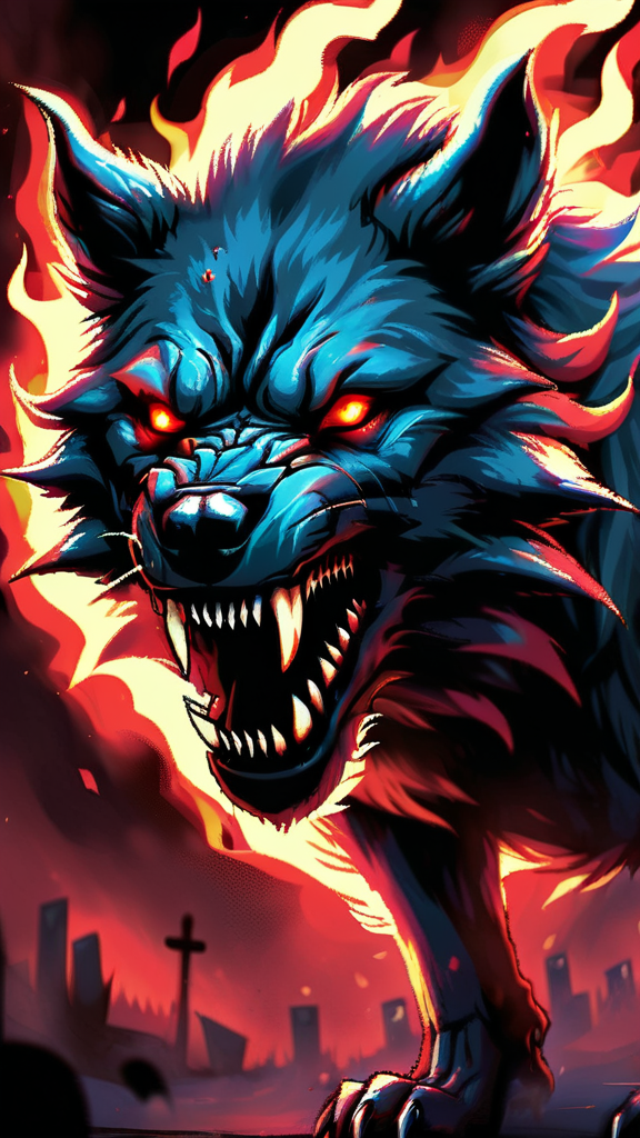 Horror, dark fantasy. Hellhound, demonic wolf. A huge wolf with jet black fur and glowing/shining red eyes. It has an aura of red flames and appears to be on fire. It can breathe these red flames from its mouth, and black smoke exudes from its nostrils. Large, sharp fangs and claws. It roams the night looking for unrepentant sinners, or is sent to collect the souls of those that have made deals with demons. Its usually invisible to most people, but the people or person it's hunting can see it clearly. It moves very fast and can run in mid air if it desires. Once it spots its target, it pursues until the victim is caught and dragged down to Hell. It disappears at dawn, not liking light, for light represents good and God.