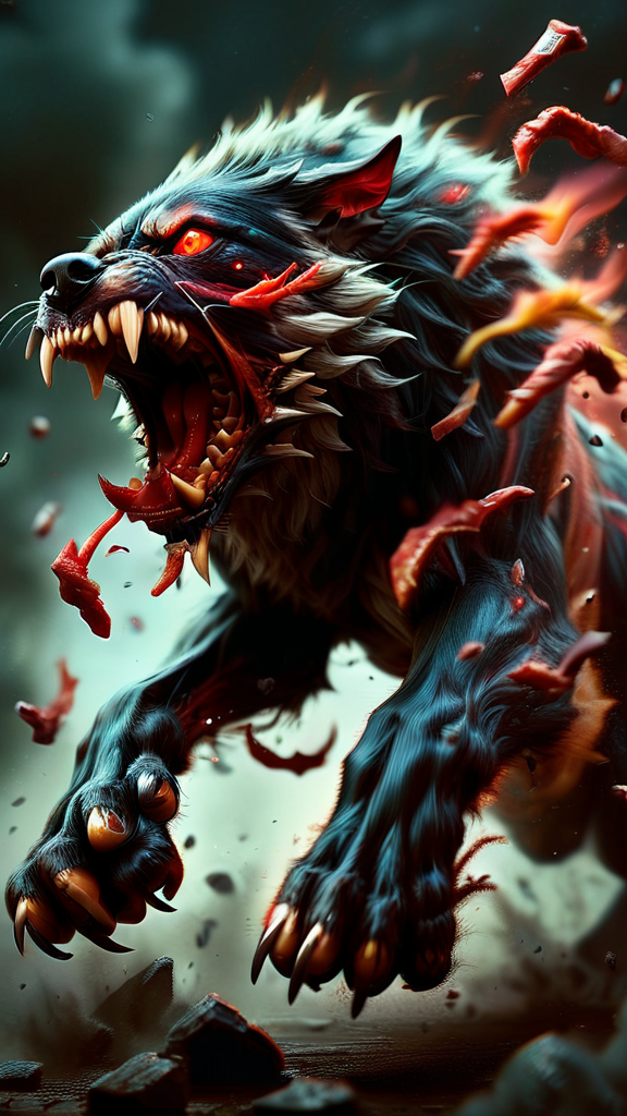 Horror, dark fantasy. Hellhound, demonic wolf. A huge wolf with jet black fur and glowing/shining red eyes. It has an aura of red flames and appears to be on fire. It can breathe these red flames from its mouth, and black smoke exudes from its nostrils. Large, sharp fangs and claws. It roams the night looking for unrepentant sinners, or is sent to collect the souls of those that have made deals with demons. Its usually invisible to most people, but the people or person it's hunting can see it clearly. It moves very fast and can run in mid air if it desires. Once it spots its target, it pursues until the victim is caught and dragged down to Hell. It disappears at dawn, not liking light, for light represents good and God.