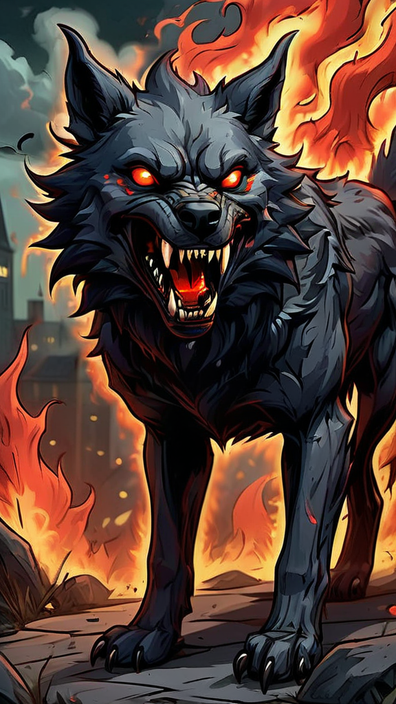 Horror, dark fantasy. Hellhound, demonic wolf. A huge wolf with jet black fur and glowing/shining red eyes. It has an aura of red flames and appears to be on fire. It can breathe these red flames from its mouth, and black smoke exudes from its nostrils. Large, sharp fangs and claws. It roams the night looking for unrepentant sinners, or is sent to collect the souls of those that have made deals with demons. Its usually invisible to most people, but the people or person it's hunting can see it clearly. It moves very fast and can run in mid air if it desires. Once it spots its target, it pursues until the victim is caught and dragged down to Hell. It disappears at dawn, not liking light, for light represents good and God.
