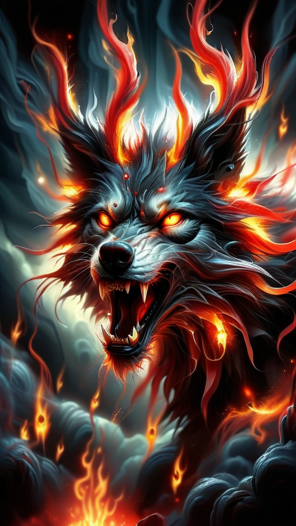 Horror, dark fantasy. Hellhound, demonic wolf. A huge wolf with jet black fur and glowing/shining red eyes. It has an aura of red flames and appears to be on fire. It can breathe these red flames from its mouth, and black smoke exudes from its nostrils. Large, sharp fangs and claws. It roams the night looking for unrepentant sinners, or is sent to collect the souls of those that have made deals with demons. Its usually invisible to most people, but the people or person it's hunting can see it clearly. It moves very fast and can run in mid air if it desires. Once it spots its target, it pursues until the victim is caught and dragged down to Hell. It disappears at dawn, not liking light, for light represents good and God.