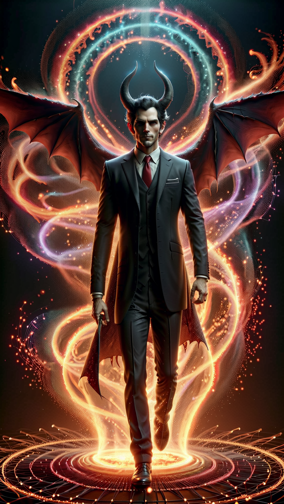 Horror, dystopia, the inverted pentagram, Satanism. He wants to be your President, and he is Satan's son. He looks suave and debonair, worldly, a true gentleman; he is anything but. He is cruel, EVIL, sadistic, and darkness arises wherever his shadow falls. He appears as a handsome and charming guy middle aged caucadian man, but that is just a disguise; his true form is as follows: Very tall, slim but muscular, sinewy. Broad shoulders, narrow waist, muscular arms and legs. His skin is death white, his eyes are glowing red, his eyelids are shadowed. His jet black hair is cut very short on the sides and back, longer on top and slicked back. He has two white ivory devil horns growing from his temples, small but sharp and curving upwards. He wears an expensive black suit with a Scarlet red button up shirt and a black tie. Shiny black dress shoes, and a single shoulder short cape made to look like two long black bat wings with silver lacy patterns. For all his powers, his favorite is a long flaming whip made of fire-- he uses it whether he's in a good mood or bad mood. He projects an aura of red flames, the Hell fire of his real home. If he gets elected, the world will fall into eternal twilight-- dusk and night, but never dawn. There will be a Baphomet statue on the front lawn of the White House. All his followers are waiting... Full body pose.