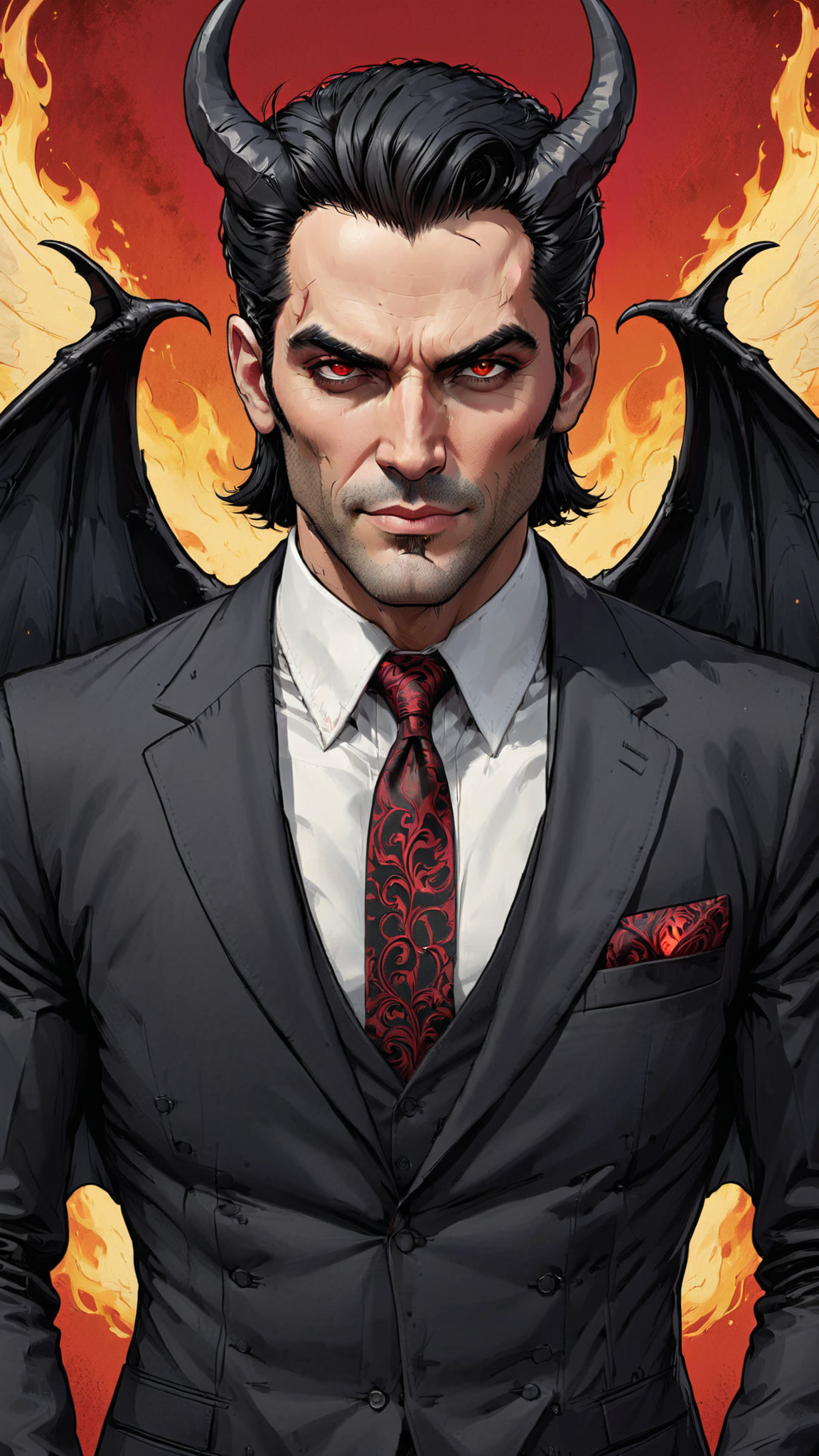 Horror, dystopia, the inverted pentagram, Satanism. He wants to be your President, and he is Satan's son. He looks suave and debonair, worldly, a true gentleman; he is anything but. He is cruel, EVIL, sadistic, and darkness arises wherever his shadow falls. He appears as a handsome and charming guy middle aged caucadian man, but that is just a disguise; his true form is as follows: Very tall, slim but muscular, sinewy. Broad shoulders, narrow waist, muscular arms and legs. His skin is death white, his eyes are glowing red, his eyelids are shadowed. His jet black hair is cut very short on the sides and back, longer on top and slicked back. He has two white ivory devil horns growing from his temples, small but sharp and curving upwards. He wears an expensive black suit with a Scarlet red button up shirt and a black tie. Shiny black dress shoes, and a single shoulder short cape made to look like two long black bat wings with silver lacy patterns. For all his powers, his favorite is a long flaming whip made of fire-- he uses it whether he's in a good mood or bad mood. He projects an aura of red flames, the Hell fire of his real home. If he gets elected, the world will fall into eternal twilight-- dusk and night, but never dawn. There will be a Baphomet statue on the front lawn of the White House. All his followers are waiting... Full body pose.