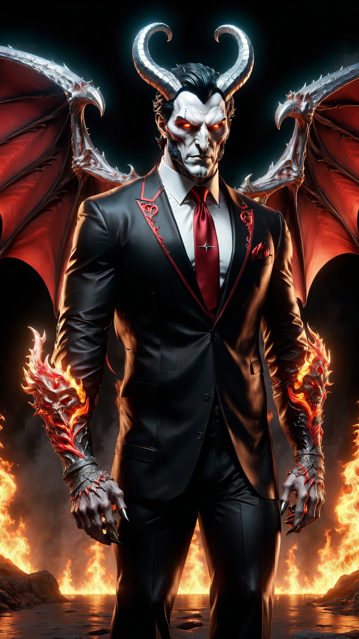 Horror, dystopia, the inverted pentagram, Satanism. He wants to be your President, and he is Satan's son. He looks suave and debonair, worldly, a true gentleman; he is anything but. He is cruel, EVIL, sadistic, and darkness arises wherever his shadow falls. He appears as a handsome and charming guy middle aged caucadian man, but that is just a disguise; his true form is as follows: Very tall, slim but muscular, sinewy. Broad shoulders, narrow waist, muscular arms and legs. His skin is death white, his eyes are glowing red, his eyelids are shadowed. His jet black hair is cut very short on the sides and back, longer on top and slicked back. He has two white ivory devil horns growing from his temples, small but sharp and curving upwards. He wears an expensive black suit with a Scarlet red button up shirt and a black tie. Shiny black dress shoes, and a single shoulder short cape made to look like two long black bat wings with silver lacy patterns. For all his powers, his favorite is a long flaming whip made of fire-- he uses it whether he's in a good mood or bad mood. He projects an aura of red flames, the Hell fire of his real home. If he gets elected, the world will fall into eternal twilight-- dusk and night, but never dawn. There will be a Baphomet statue on the front lawn of the White House. All his followers are waiting... Full body pose.