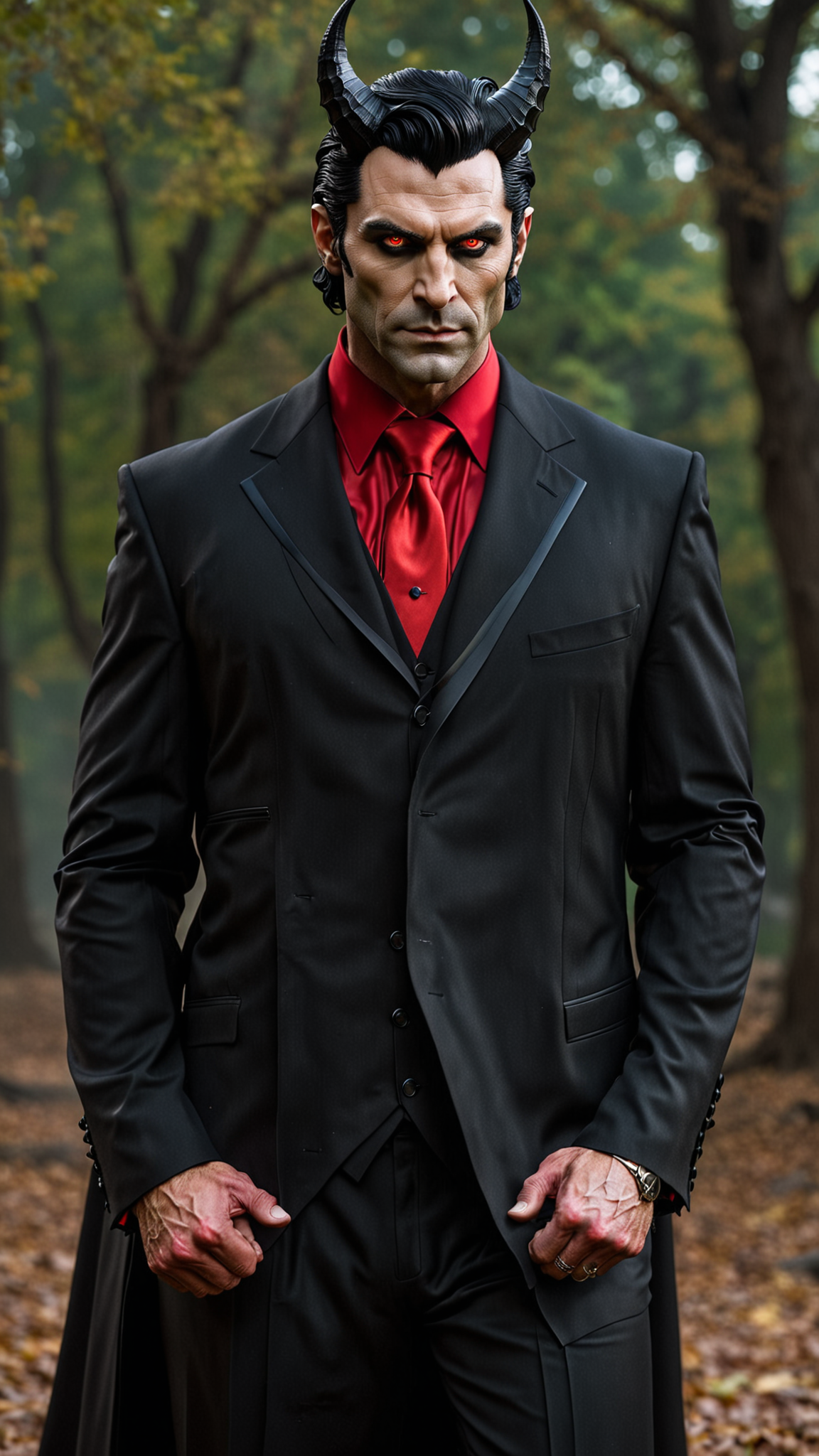 Horror, dystopia, the inverted pentagram, Satanism. He wants to be your President, and he is Satan's son. He looks suave and debonair, worldly, a true gentleman; he is anything but. He is cruel, EVIL, sadistic, and darkness arises wherever his shadow falls. He appears as a handsome and charming guy middle aged caucadian man, but that is just a disguise; his true form is as follows: Very tall, slim but muscular, sinewy. Broad shoulders, narrow waist, muscular arms and legs. His skin is death white, his eyes are glowing red, his eyelids are shadowed. His jet black hair is cut very short on the sides and back, longer on top and slicked back. He has two white ivory devil horns growing from his temples, small but sharp and curving upwards. He wears an expensive black suit with a Scarlet red button up shirt and a black tie. Shiny black dress shoes, and a single shoulder short cape made to look like two long black bat wings with silver lacy patterns. For all his powers, his favorite is a long flaming whip made of fire-- he uses it whether he's in a good mood or bad mood. He projects an aura of red flames, the Hell fire of his real home. If he gets elected, the world will fall into eternal twilight-- dusk and night, but never dawn. There will be a Baphomet statue on the front lawn of the White House. All his followers are waiting... Full body pose.
