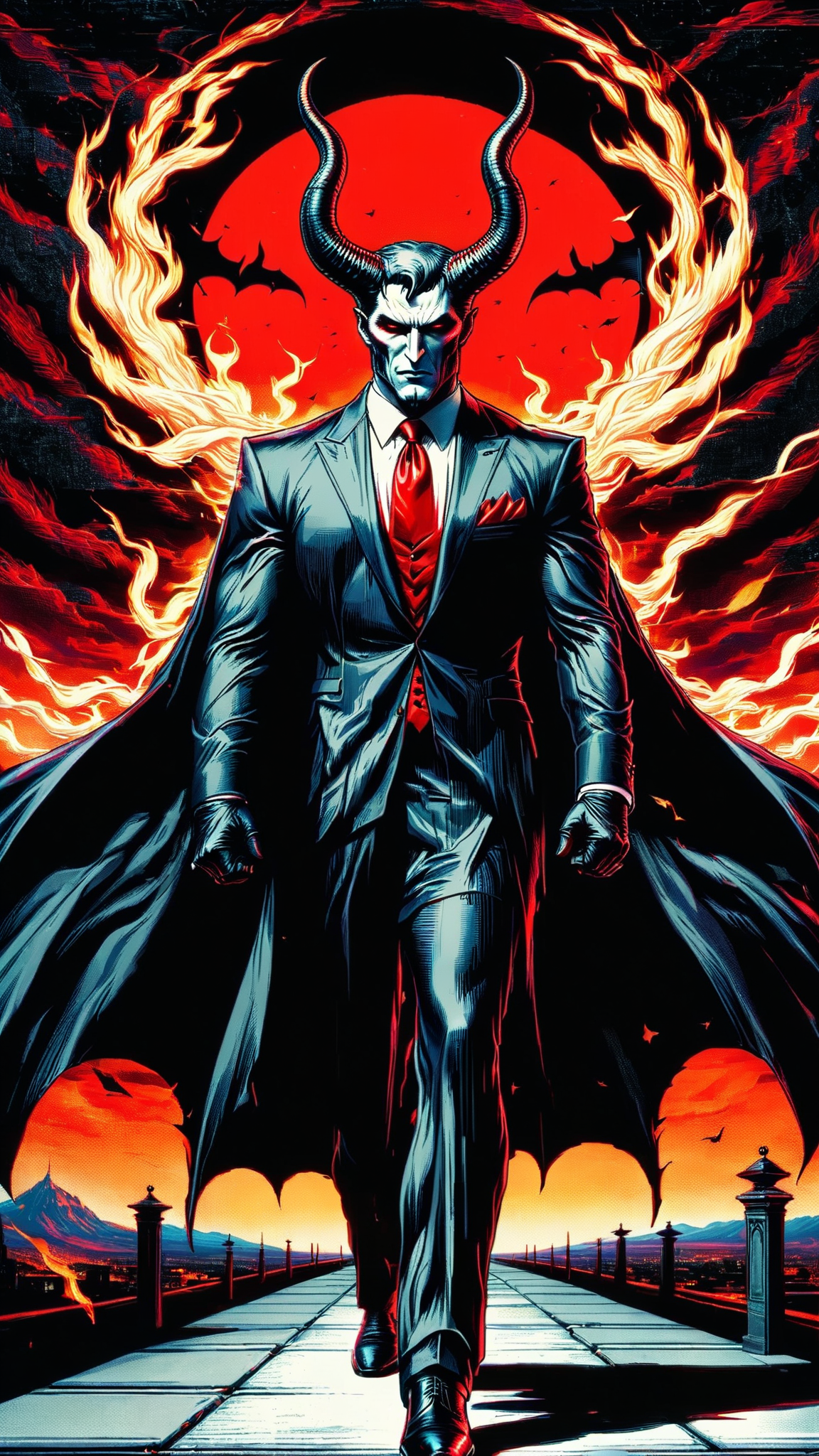 Horror, dystopia, the inverted pentagram, Satanism. He wants to be your President, and he is Satan's son. He looks suave and debonair, worldly, a true gentleman; he is anything but. He is cruel, EVIL, sadistic, and darkness arises wherever his shadow falls. He appears as a handsome and charming guy middle aged caucadian man, but that is just a disguise; his true form is as follows: Very tall, slim but muscular, sinewy. Broad shoulders, narrow waist, muscular arms and legs. His skin is death white, his eyes are glowing red, his eyelids are shadowed. His jet black hair is cut very short on the sides and back, longer on top and slicked back. He has two white ivory devil horns growing from his temples, small but sharp and curving upwards. He wears an expensive black suit with a Scarlet red button up shirt and a black tie. Shiny black dress shoes, and a single shoulder short cape made to look like two long black bat wings with silver lacy patterns. For all his powers, his favorite is a long flaming whip made of fire-- he uses it whether he's in a good mood or bad mood. He projects an aura of red flames, the Hell fire of his real home. If he gets elected, the world will fall into eternal twilight-- dusk and night, but never dawn. There will be a Baphomet statue on the front lawn of the White House. All his followers are waiting... Full body pose.