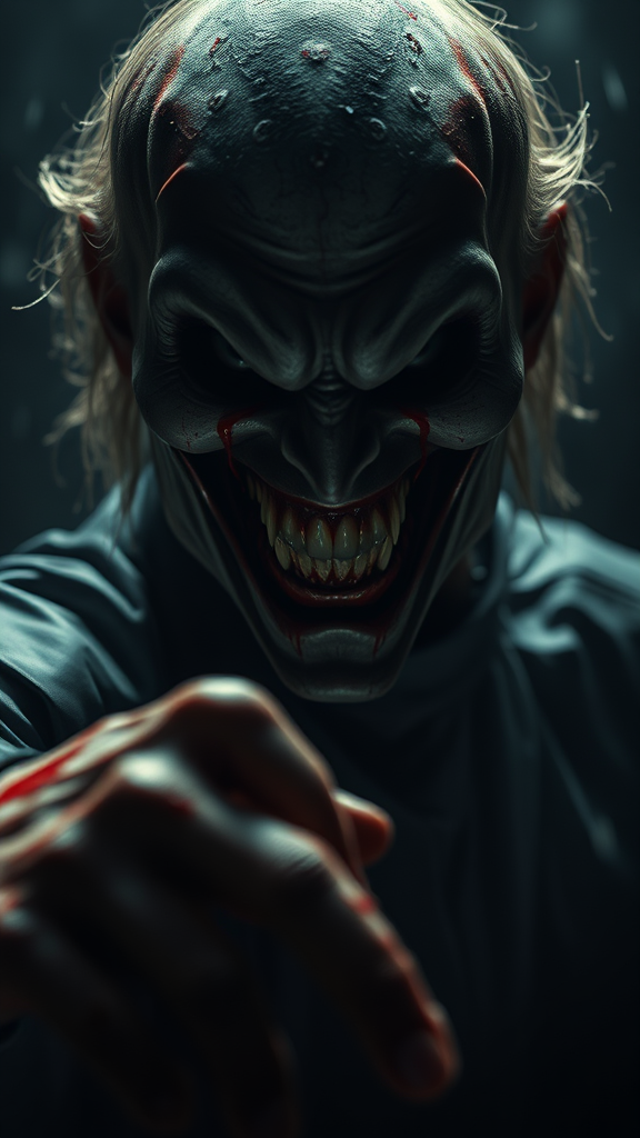 horror, eerie atmosphere, menacing grin, blood splatter, unsettling presence, dark cinematic style, dynamic shadowy pose, immersive surreal background, hauntingly vivid, ultra high resolution, 8k, raw image capture, hyperrealistic detail, photographic intensity, nightmarish vision, tension-filled aura