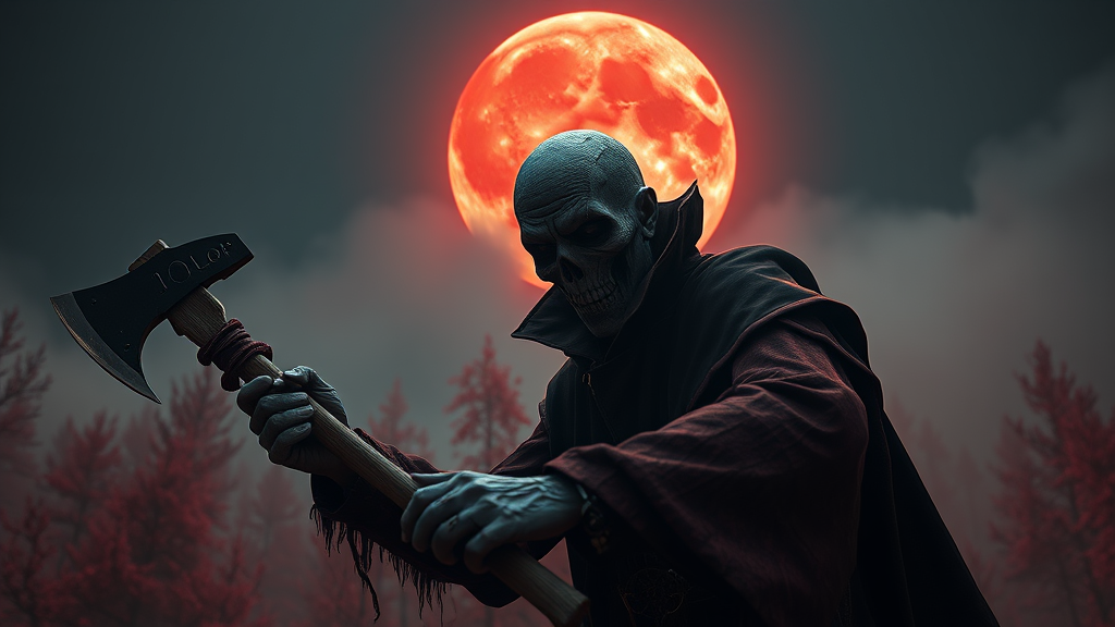 Horror, highly detailed portrayal of a man necromancer wielding an axe, face clearly visible, reminiscent of Jack the Ripper, set against a blood moon with rolling volumetric fog, a crimson forest in the background. The scene captures hyperrealism with stunning ultra-realistic details, crafted in Unreal Engine. The cinematic lighting enhances the breathtaking photography of the eerie environment, depicted through a wide-angle lens. The figure presents with deformed, mutated CGI features, exhibiting bad anatomy with extra arms and fingers, poorly drawn hands, and a disfigured, almost doll-like appearance. The image is a blend of octane rendering, characterized by a haunting, blurry, and fuzzy atmosphere, where details seamlessly tile into one another.