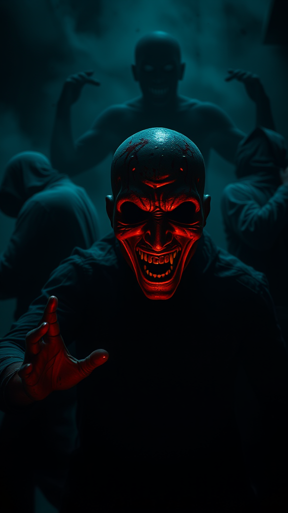 Horror nightmarish scene, unsettling figures, mysterious ambiance, chilling shadows, ominous silhouettes, eerie blood splatter, dark mood, sinister grin, dynamic and haunting poses, immersive and haunting background, ultra high-resolution detail, cinematic quality, 8k hyperrealism, raw and vivid photography, atmospheric tension, surreal and psychological elements, dark and moody tone.