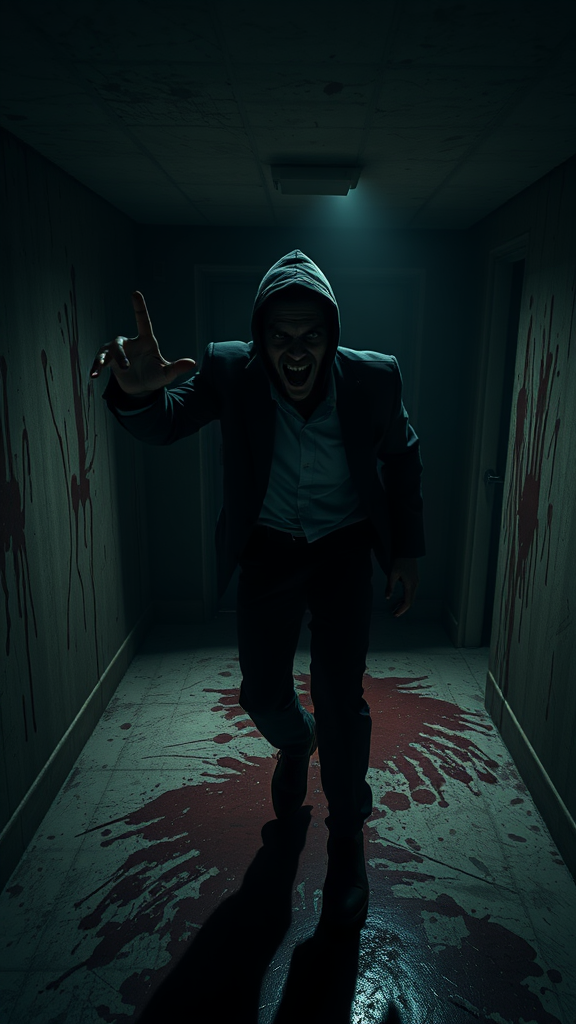 horror scene, chilling atmosphere, unsettling whispers, darkly lit room, blood splatter on the walls, sinister figure in dynamic pose, menacing grin, reminiscent of Donnie Darko, hauntingly immersive background, eerie shadows cast long, ultra highres quality, 8k resolution, raw photo capturing hyperrealism, evocative mood, spine-tingling ambiance, photographic precision, intricate details, atmospheric tension.
