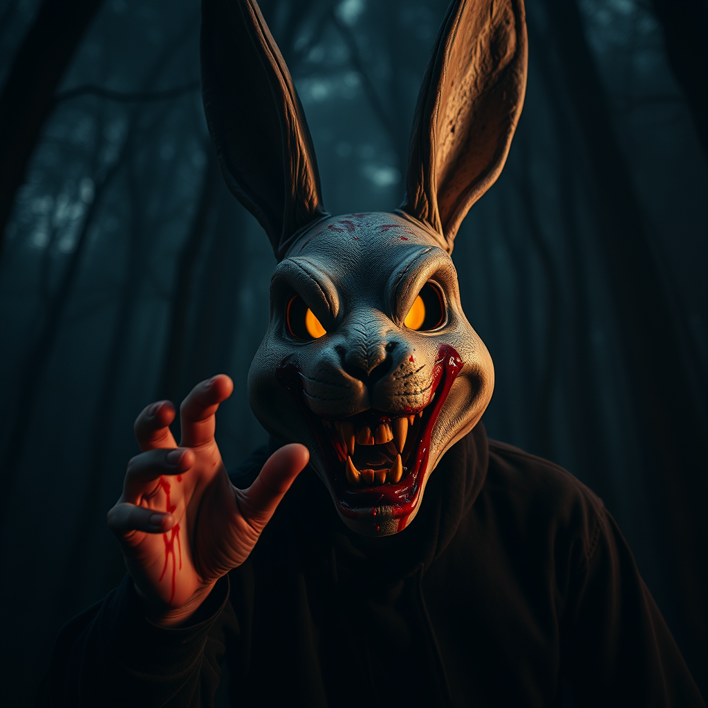horror scene cinematic thrilling atmosphere blood splatter wicked grin dynamic pose immersive eerie forest surreal rabbit mask ominous presence ultra highres 8k raw photo hyperrealism intense shadowy photography nightmarish unsettling mood cinematic effect dramatic lighting mysterious fog chilling ambiance