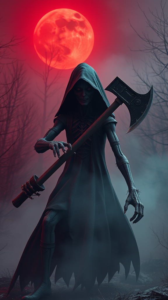 Horror scene with a highly detailed figure of a necromancer wielding an axe, his face eerily visible, drawing inspiration from Jack the Ripper, set under a blood moon. The scene is enveloped in volumetric fog, with a red-hued forest serving as the backdrop. The atmosphere is hyperrealistic, rendered with breathtaking, ultra-realistic detail using Unreal Engine. The cinematic lighting creates a stunning environment, captured through a wide-angle lens. The necromancer appears deformed and mutated, his cgi form resembling a distorted 3D doll. Details include bad anatomy, with extra arms and fingers, poorly drawn hands, and a disfigured appearance, merged with a tiling effect to amplify the horror.