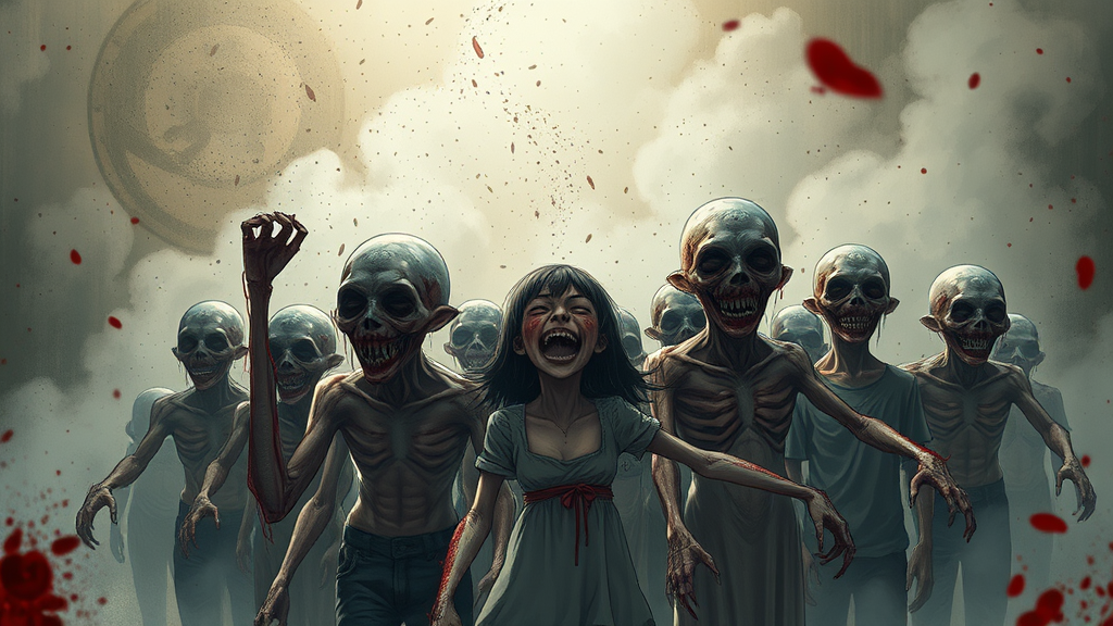 Horror scene with yandere character, blood splatter, chilling atmosphere, sinister expressions, evil laugh echoing through the air, ultra highres 8k raw photo capturing intense details, hyperrealism blended with illustration, hauntingly deformed figures with grotesque features, multiple misshapen arms and legs, two heads on one body, a disfigured group of people gathered ominously, twisted spines and sinister grins conveying a sense of dread and madness.