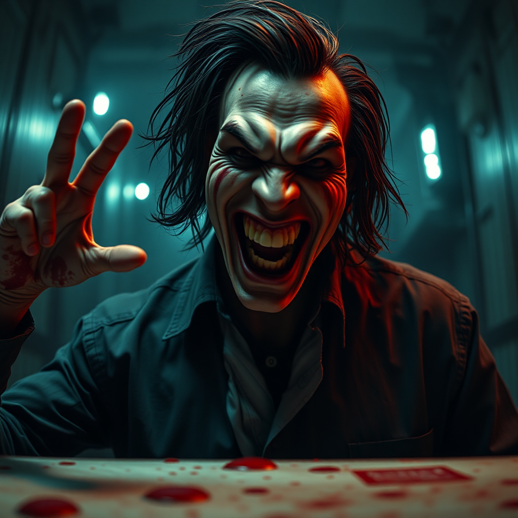 Horror theme with blood splatter and eerie ambiance akin to Donnie Darko, featuring a sinister character with an evil laugh in a dynamic pose set against an immersive, unsettling background. Captured in ultra high-resolution, 8k quality, this hyperrealistic photograph showcases fine details, creating a vivid and atmospheric scene.