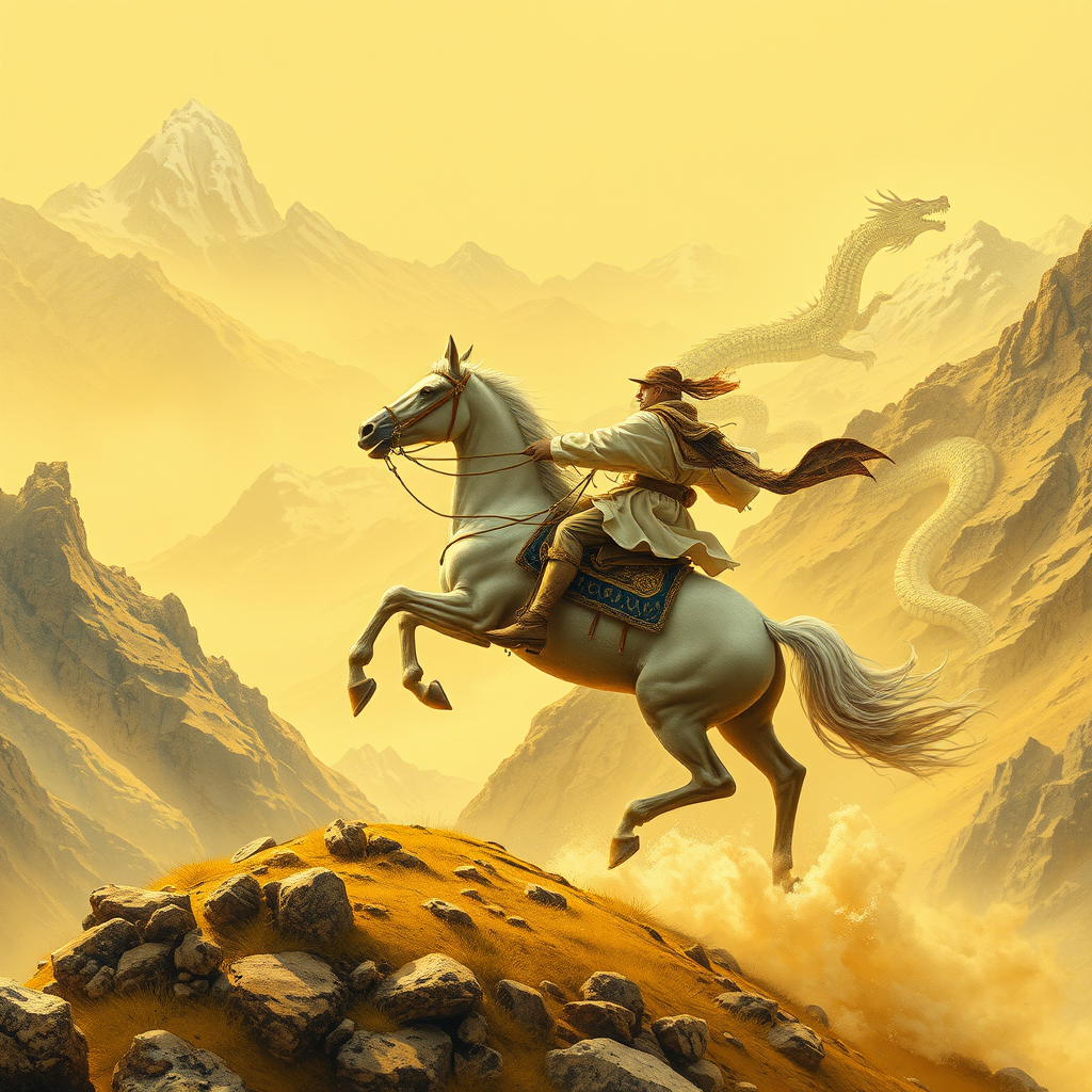 Horse rider galloping across a vast, mountainous landscape, with a cinematic montage style that incorporates elements of mythical dragon art. Inspired by the intricate and surreal flair of Franciszek Starowieyski and the detailed fantasy world of John Howe. The scene is bathed in a palette dominated by yellow and white, evoking the ethereal quality of Himalayan art. The hyper-realistic details capture the dynamic movement of the rider and horse, blending seamlessly with the fantastical elements of dragons woven into the landscape.