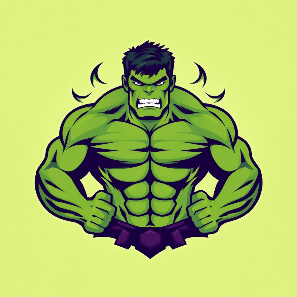 Hulk illustration featuring a symmetrical design with bold contours and vivid colors, capturing his iconic muscular physique and intense expression in a flat icon style, while incorporating subtle texture for depth and a slightly exaggerated jawline to emphasize strength. The background is minimalistic with a hint of green gradient, enhancing his powerful presence.