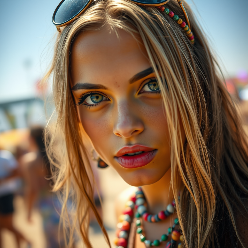 Human female gazing directly at the lens, intricately detailed, ultra-high definition quality, cascading long hair, full lips, expressive large eyes, vibrant Coachella vibe, free-spirited hippie essence, hints of Burning Man flair, adorned in eclectic festival attire with colorful accessories amidst the electrifying energy of a music festival.