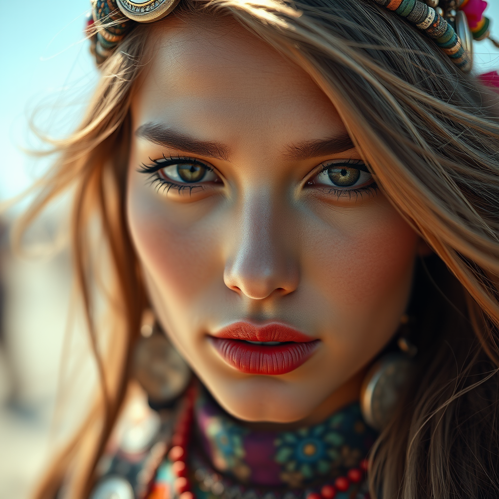 Human female subject gazing into the lens, exquisitely detailed and captured in high dynamic range, 8k resolution, featuring flowing long hair, full lips, and large expressive eyes. She embodies the essence of festival culture, merging the vibrant spirit of Coachella with the free-spirited vibe of Burning Man; adorned in eclectic, bohemian attire with colorful, intricate patterns and accessories that reflect a modern hippie aesthetic.