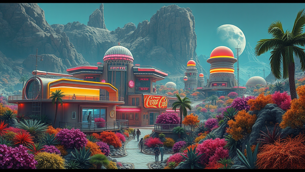Human settlement on an uncharted planet featuring retro futuristic architecture with bright, vibrant vegetation and slightly toned hyperrealism. The scene showcases highly detailed buildings with neon accents, nestled amidst lush, colorful foliage, creating a captivating, immersive landscape. The architecture blends nostalgia with visionary design, as inhabitants explore the vividly hued terrain, enveloped in an otherworldly yet familiar atmosphere.