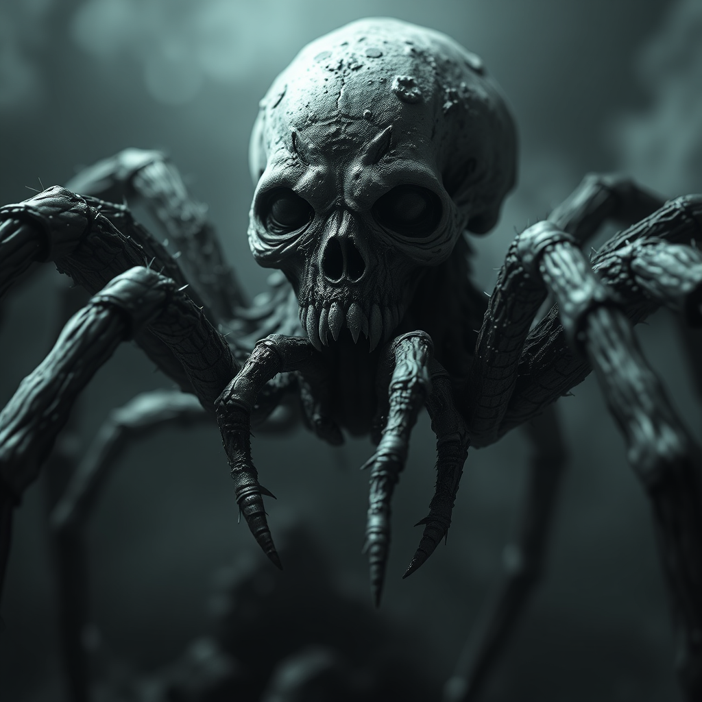 Human-spider hybrid, eerie mutant with a human head and arachnid legs emerging from its mouth, inspired by Gustave Doré, dark and haunting scene in monochrome, dramatic and unsettling ambiance, intricately crafted with magical undertones, hyper-realistic 3D fantasy art, enhanced with volumetric lighting, finely detailed with micro textures, meticulously illustrated, hyper-detailed and realistic depiction with 8k resolution, atmospheric and intricately woven narrative, captivating and unsettling presence.